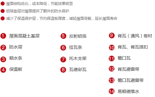 作為傳統屋面通風方案的優(yōu)化,鋁箔墊層的加入,使反射鋁箔與嵌入順水條間的保溫板形成空氣間層,代替了部分保溫板厚度,而且省去了保溫保護層。