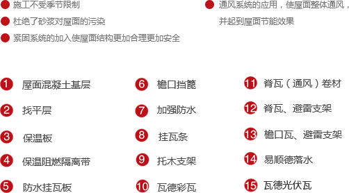 借鑒歐洲坡屋面防水理念,將平面防水改為立體防水,采用新型防水板材料,將材料防水和構造防水于一身,配合屋面系統組件,實現全天候全干作業(yè)。節(jié)省了屋面各類保護層次,打破了屋面冬季及雨后陰濕無法施工的常規(guī),縮短了工期,提升系統安全性能。